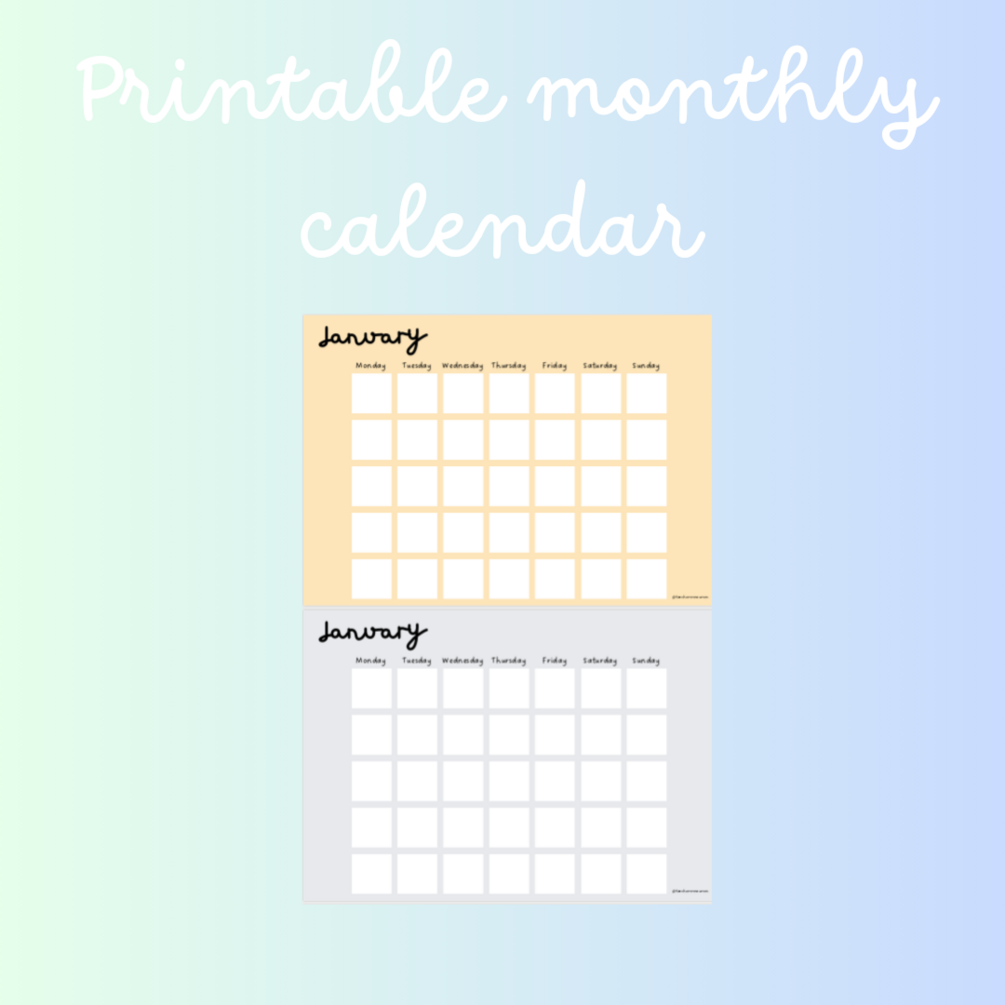 A printable monthly calendar suitable for any year. Includes colour and black and white design.