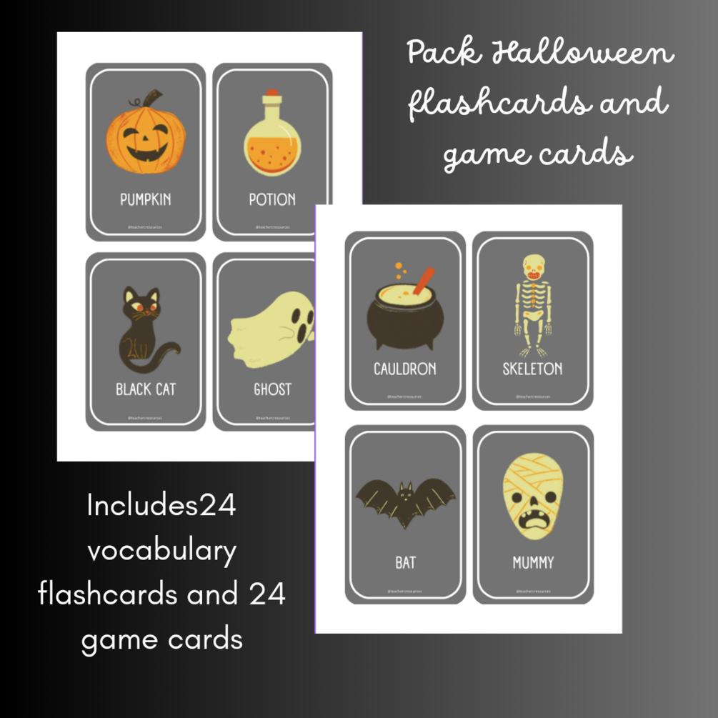 A printable PDF document containing 24 Halloween flashcards and 24 game cards